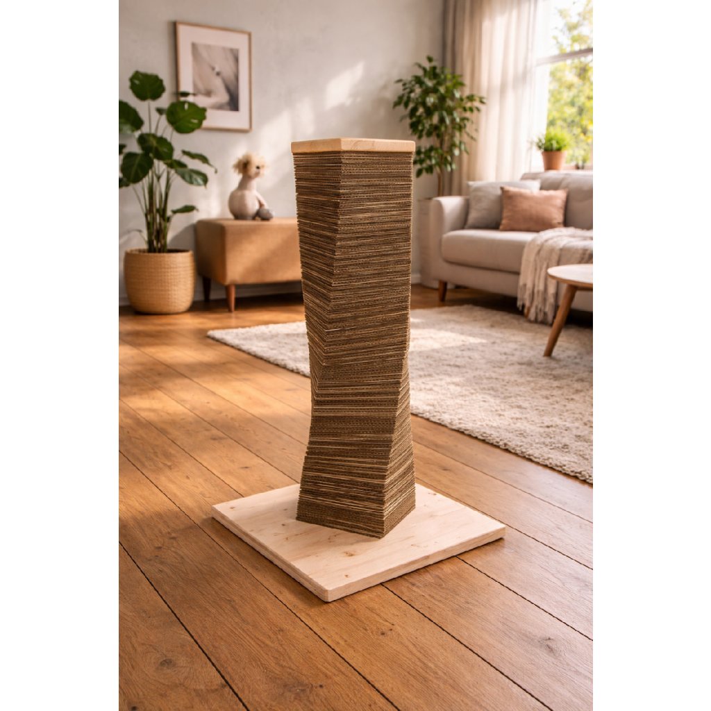 Pevný kartonový objekt pro kočku, který vydrží každodenní drápky a přitom zůstává vizuálně klidný.