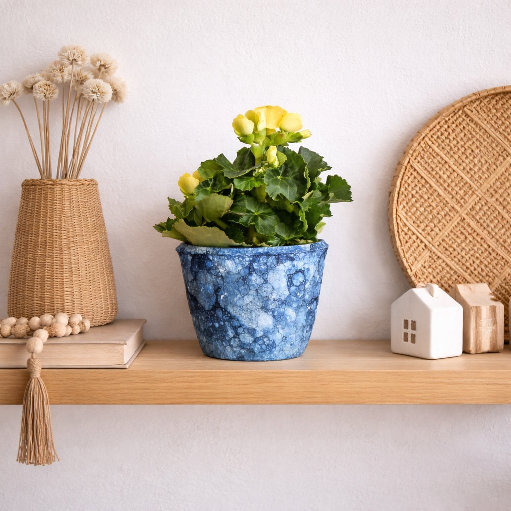 Modrý obal na květináč z recyklovaného papíru zaujme na první pohled svým abstraktním dekorem. Nezaměnitelný design bude třešničkou na dortu každého interiéru.