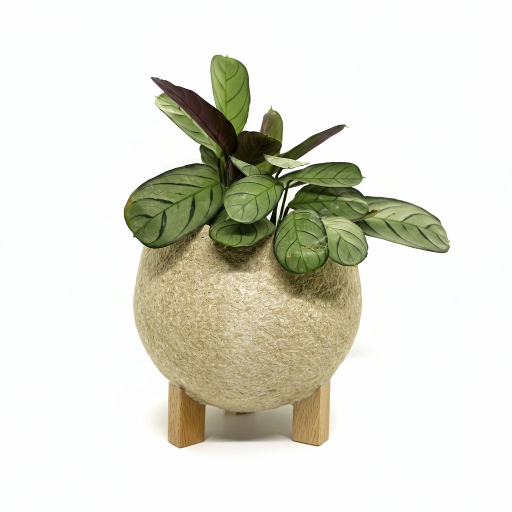 Stojací světlý obal na květináč z recyklovaného papíru s jemnou strukturou, na dřevěných nožkách, uvnitř napuštěný včelím voskem.