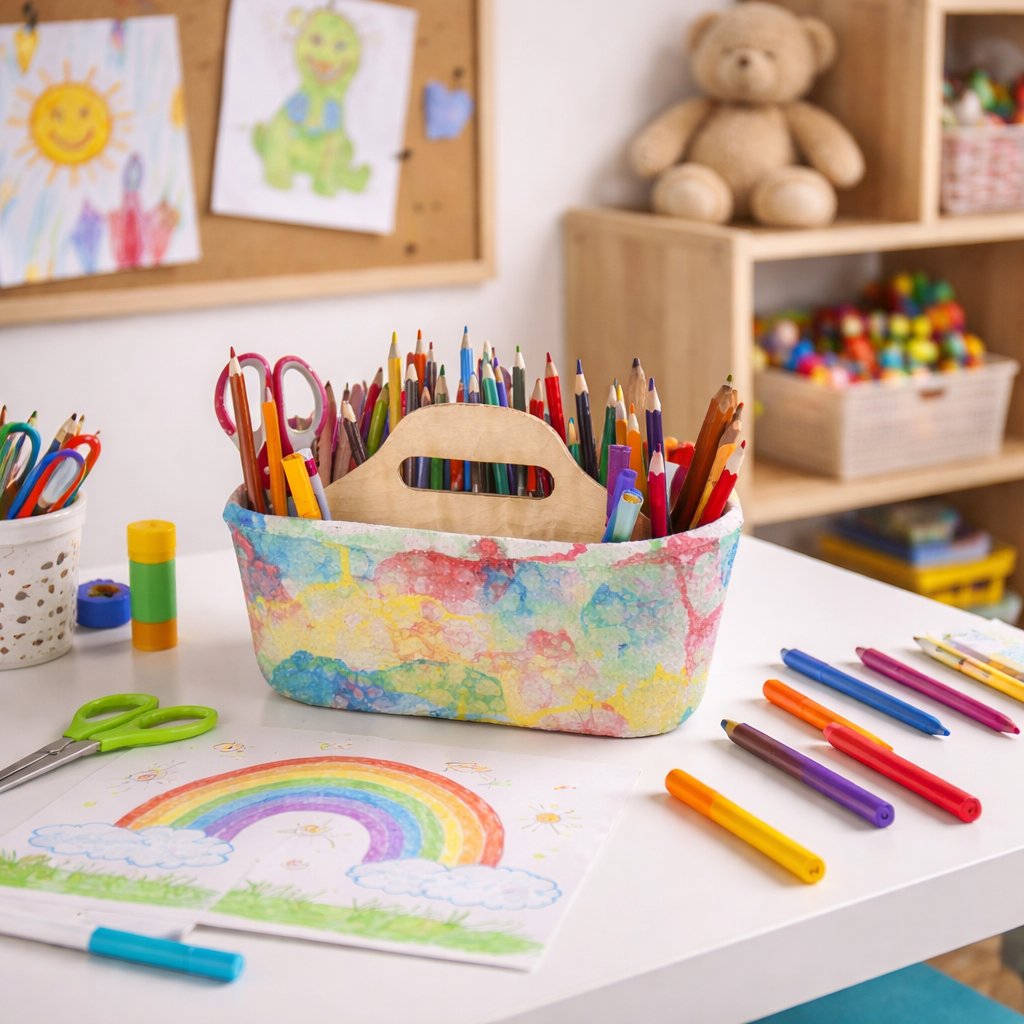 Organizér má dřevěný úchop ke snadnému přenášení a 8 přihrádek. Celkové rozměry jsou 25x15x10cm. Bude se Vám hodit na výtvarné potřeby, kosmetiku, nebo jako krásný pastelkovník. Já věřím, že mu najdete i jiná využití!