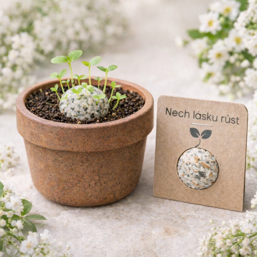 Uvnitř se ukrývá kulička plná semínek, pevně zasazená do minimalistické kraftové karty. Stačí ji doma zasadit do hlíny, zalít… a časem z ní vyrostou první lístky.