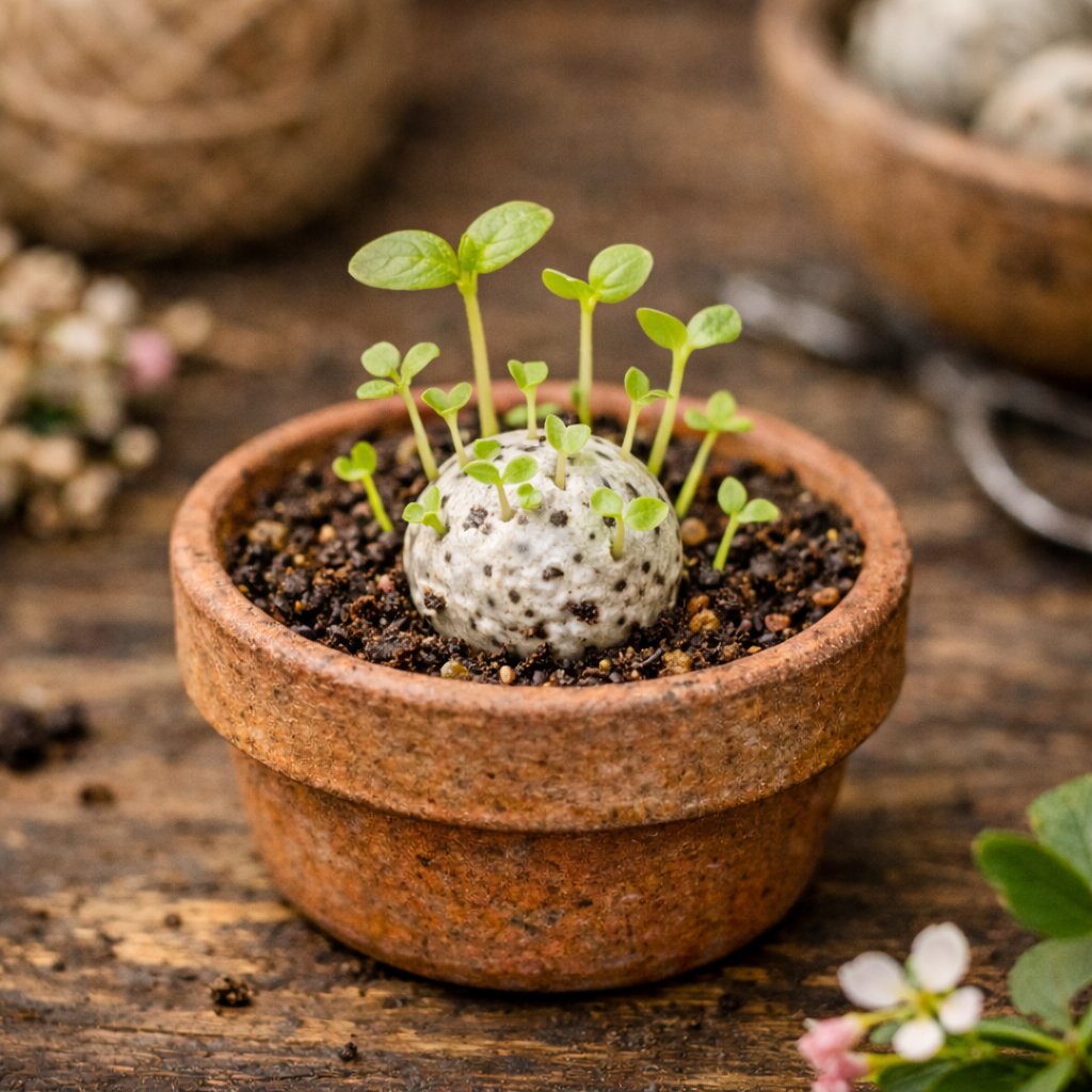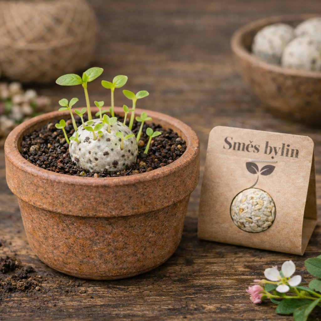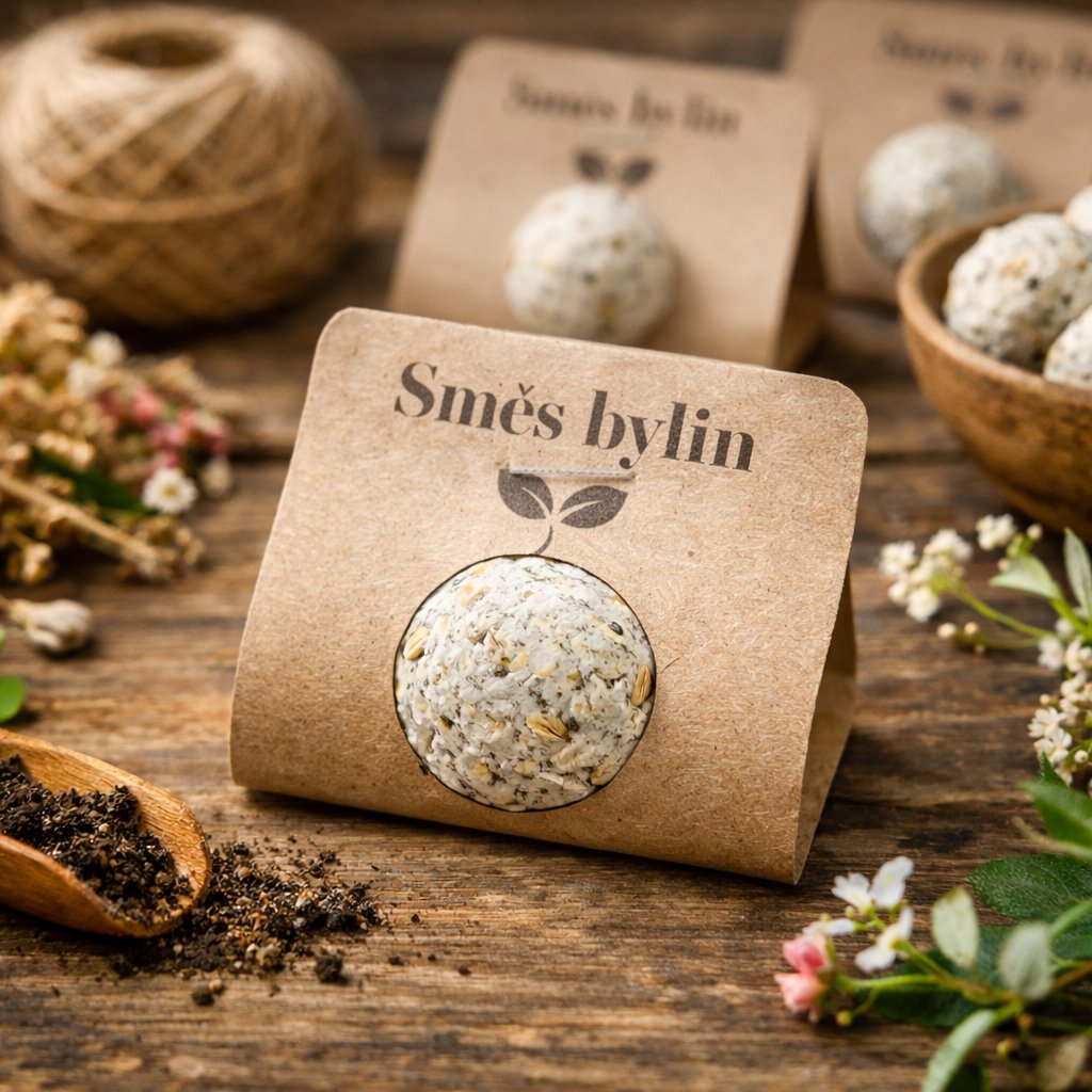 Semínková bomba – drobná kulička života uložená v minimalistické kartě. Malý dárek, který stačí zasadit… a nechat rozkvést.